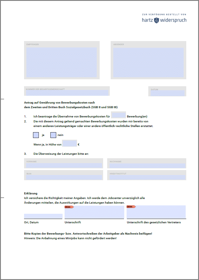 Kostenlosen Antrag auf Übernahme von Bewerbungskosten beim Jobcenter als PDF herunterladen und einfach ausfüllen für die Erstattung Ihrer Bewerbungsaufwendungen.