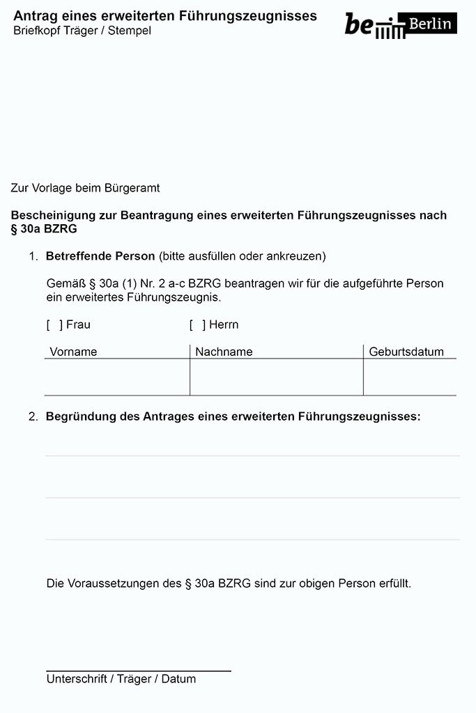 Kostenloses PDF Formular für den Antrag auf ein erweitertes Führungszeugnis in Berlin herunterladen. Einfach ausfüllen gemäß § 30a BZRG für Frau oder Herrn Vorname Nachname.