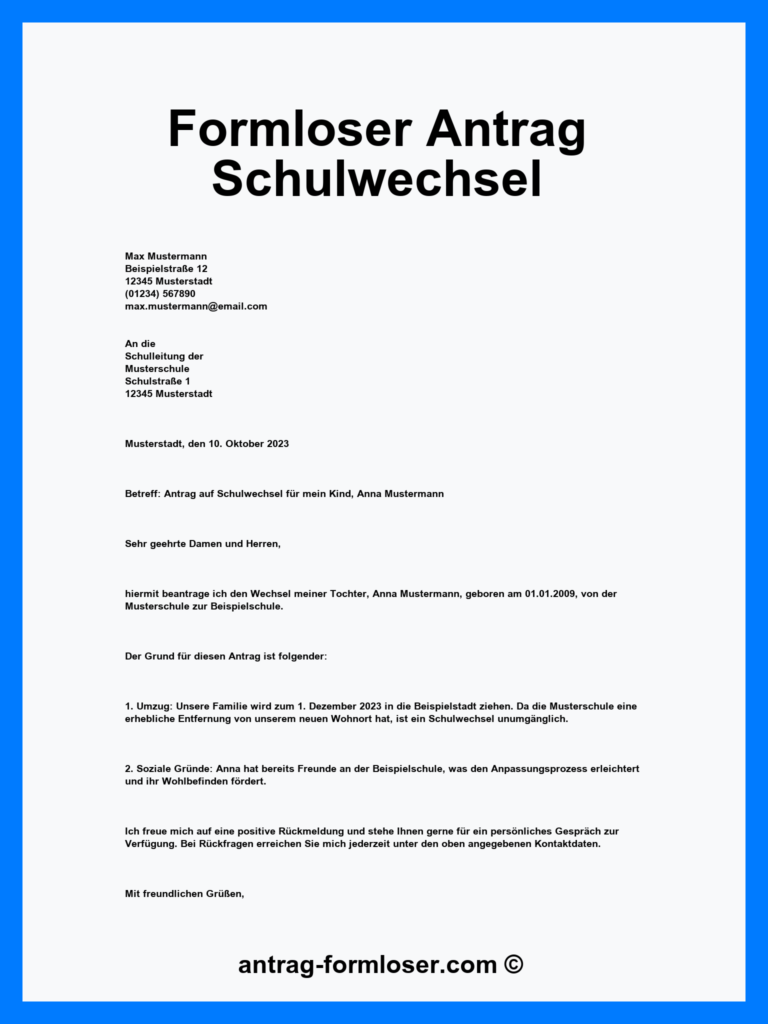 Kostenloser formloser Antrag für Schulwechsel als PDF zum Download. Einfach ausfüllen und Wechsel Ihrer Tochter/Ihres Sohnes auf neue Schule problemlos beantragen.