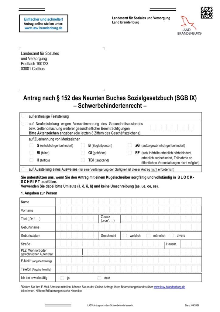 Behindertenparkausweis Antrag als kostenloses PDF herunterladen für Brandenburg. Einfache Anleitung und Formular online verfügbar unter www.lasv.brandenburg.de im Bereich Publikationen.